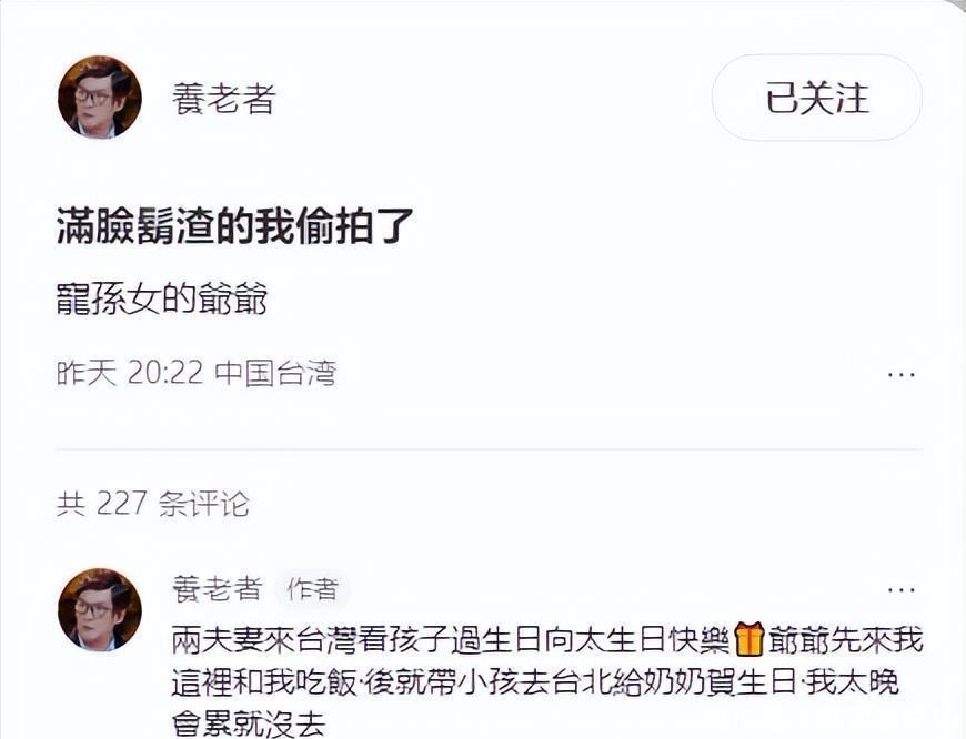 上次公公向华强生日两口子就带着孩子去给公爹庆生非常低调这次向太生日并不在香港而是在台北在1月15日郭碧婷的爸爸还在社交平台上晒出两张合影还配文满脸胡扯的我偷拍了喊亲家公为宠孙女的爷爷。